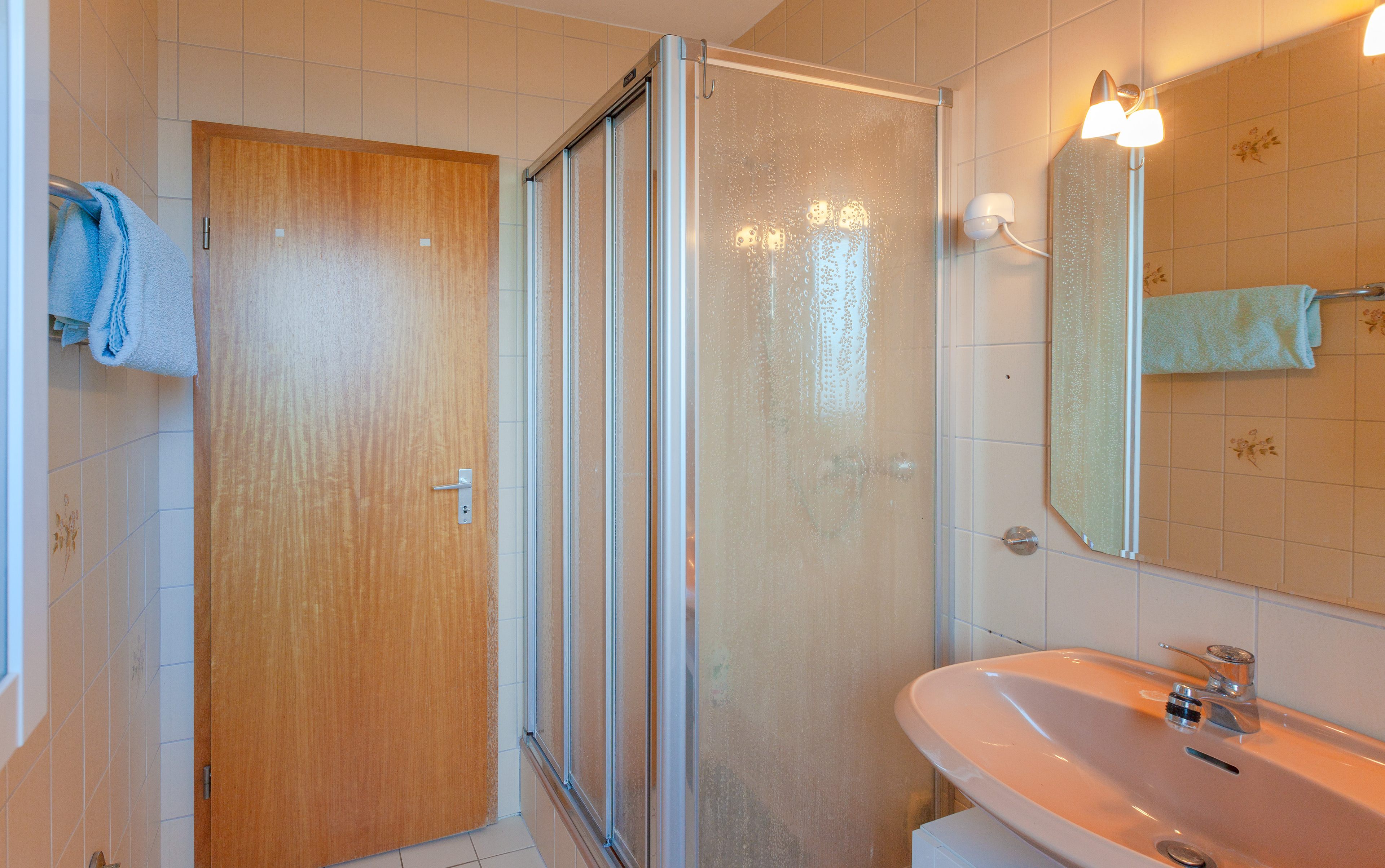 Durch einen weiteren kleinen Flur kommt man zum zweiten Duschbad mit Milchglasfenster in der ehemaligen Zweizimmerwohnung.