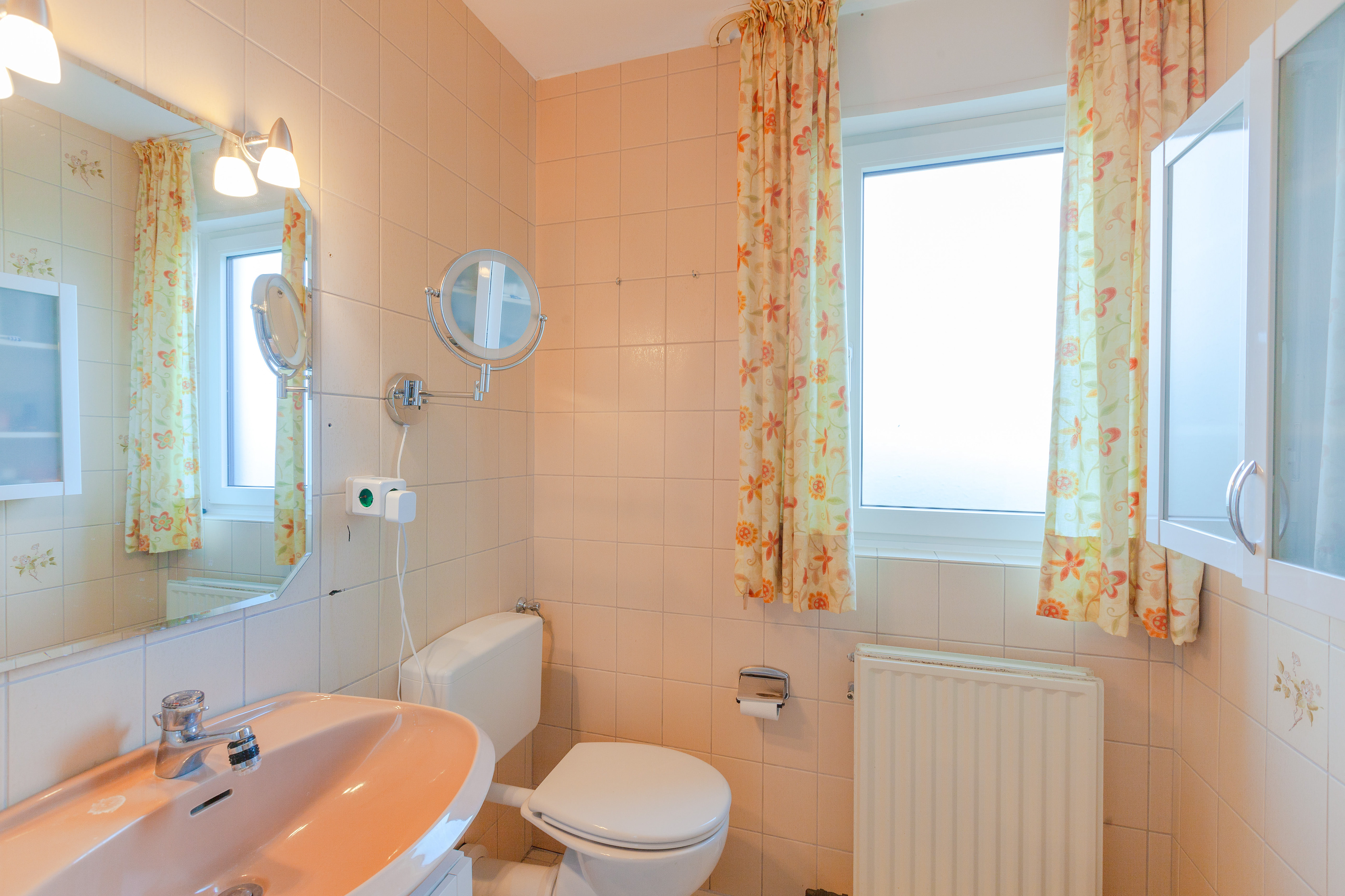 Das funktionale Gäste-WC verfügt über ein großes Fenster mit Milchglas.